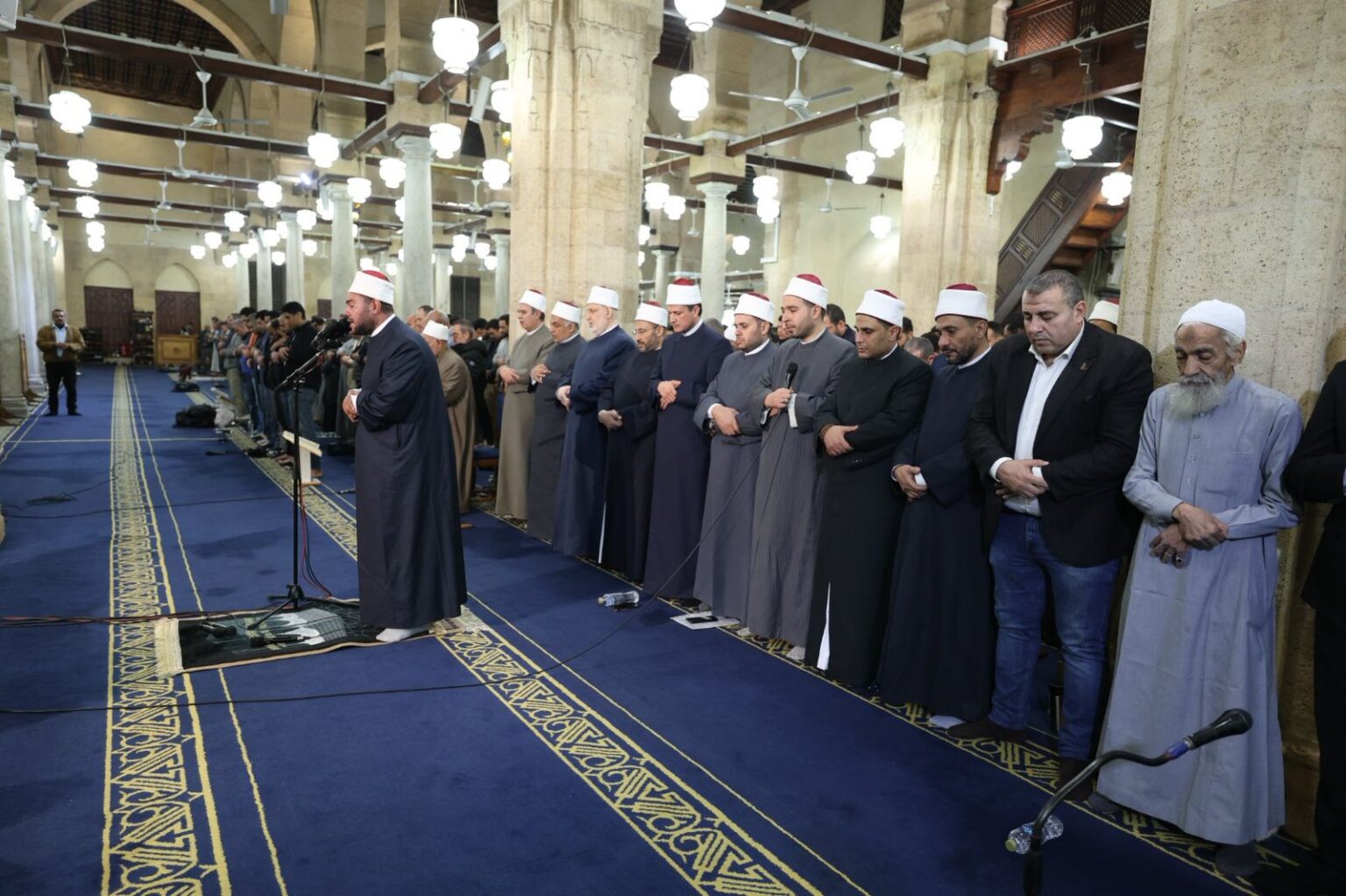 وقد رُفع أذان العشاء بصوت الشيخ محمد علاء الدين، ثم أمَّ المصلين في صلاة العشاء الشيخ رضا السويفي، قارئًا برواية الإمام حفص عن الإمام عاصم، من سورة آل عمران.