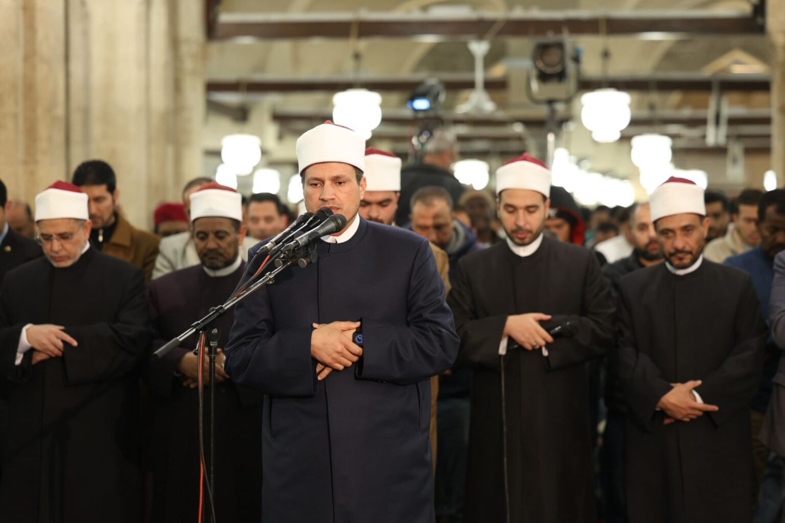 وتقدَّم صفوف المصلين فضيلة الدكتور محمد الضويني، وكيل الأزهر الشريف، وفضيلة أ.د. سلامة داود، رئيس جامعة الأزهر، وفضيلة الشيخ حسن عراقي، وكيل لجنة مراجعة المصحف، إلى جانب عدد من علماء الأزهر وقياداته.
