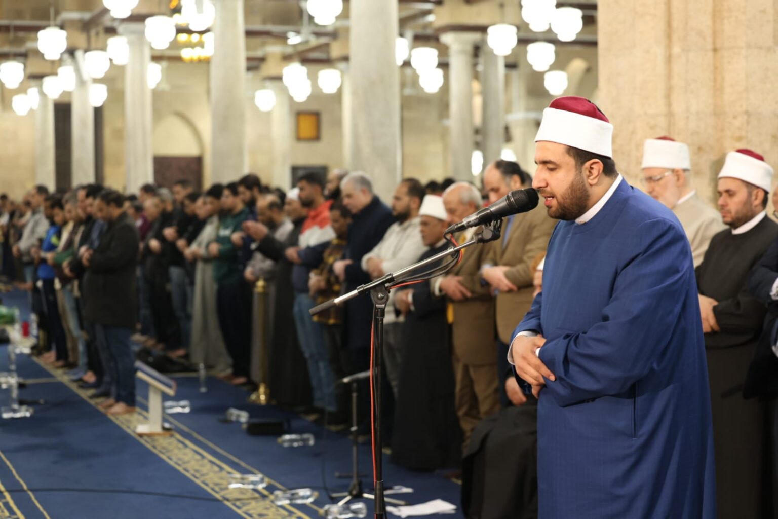 ورفع أذان العشاء الشيخ عمرو فاروق سعودي، ثم أمَّ المصلين في صلاة العشاء الدكتور أسامة الحديدي، قارئًا برواية حفص عن عاصم من سورة المائدة. وتُقام صلاة التراويح بآيات من سورتي المائدة والأنعام بالقراءات المتواترة، حيث يقرأ الشيخ أحمد سعد العجمي في الركعات الثماني الأولى برواية قالون عن الإمام نافع المدني، ثم يقرأ الشيخ محمد سالم عامر في الركعات من التاسعة حتى الرابعة عشرة برواية ورش عن الإمام نافع المدني، ثم يقرأ الشيخ كريم مسعود في الركعات من الخامسة عشرة حتى العشرين برواية البزي عن الإمام ابن كثير المكي، في تنوع يبرز امتداد الأسانيد القرآنية في المدرسة الأزهرية.