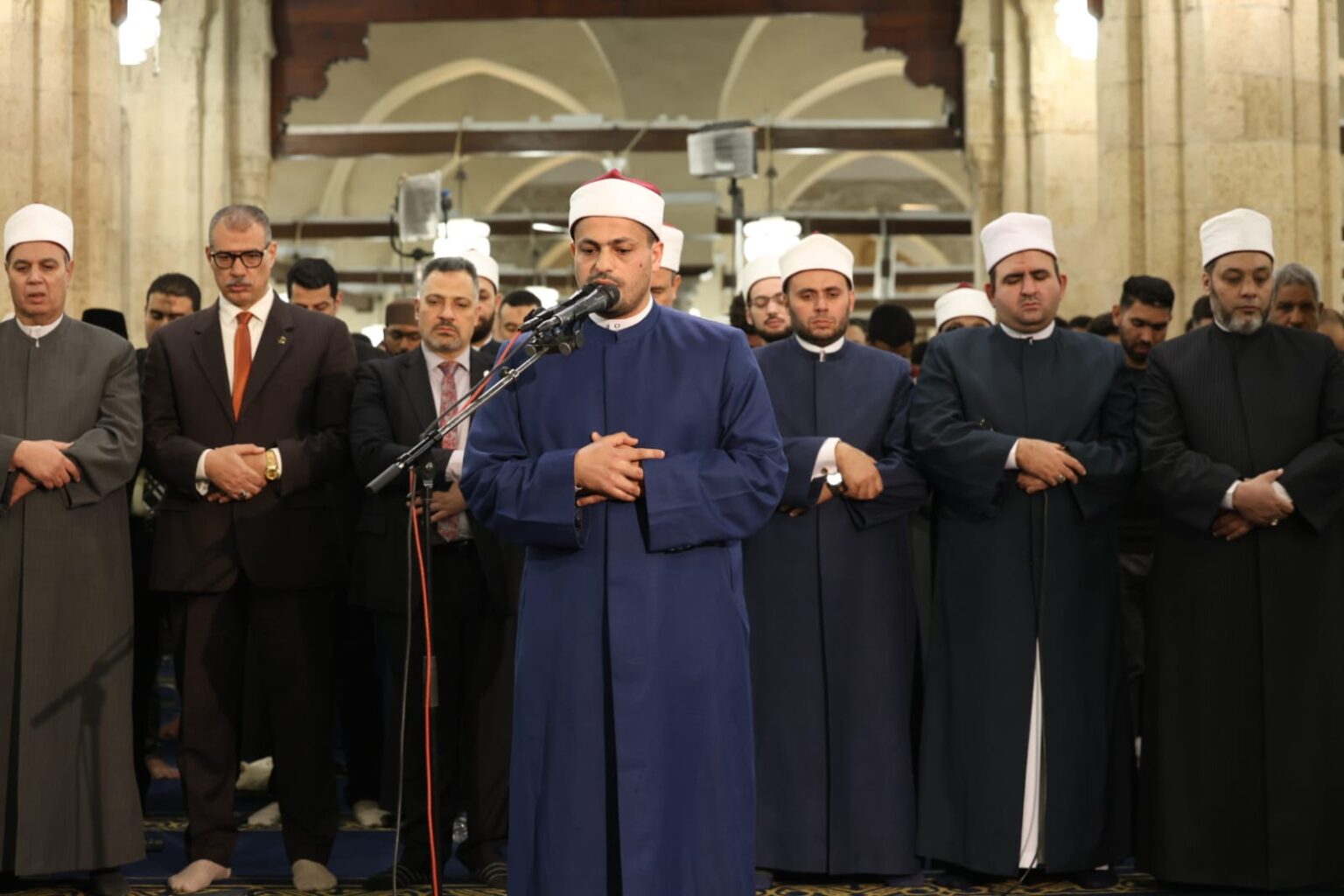 وتقدَّم صفوف المصلين الليلة فضيلة الأستاذ الدكتور محمد الضويني، وكيل الأزهر، وفضيلة الأستاذ الدكتور عبد المنعم فؤاد، المشرف العام على أروقة الجامع الأزهر، وفضيلة الدكتور محمود الهواري، الأمين العام المساعد لمجمع البحوث الإسلامية، إلى جانب لفيف من قيادات الأزهر وعلمائه، وقد أقيمت صلاة العشاء من سورة الأعراف برواية حفص عن عاصم، وأمّ المصلين فيها الشيخ محمد سالم عامر، بينما أقيمت صلاة التراويح من سورة الأعراف برواية ابن وردان عن أبي جعفر المدني، وابن ذكوان عن ابن عامر الشامي، وشعبة عن عاصم الكوفي، وأمّ المصلين فيها الدكتور محمود عزازي، والشيخ رمضان خليف، والشيخ محمد إسماعيل نور الدين، بينما أمّ المصلين في ركعتي الشفع والوتر الشيخ أحمد أنور.