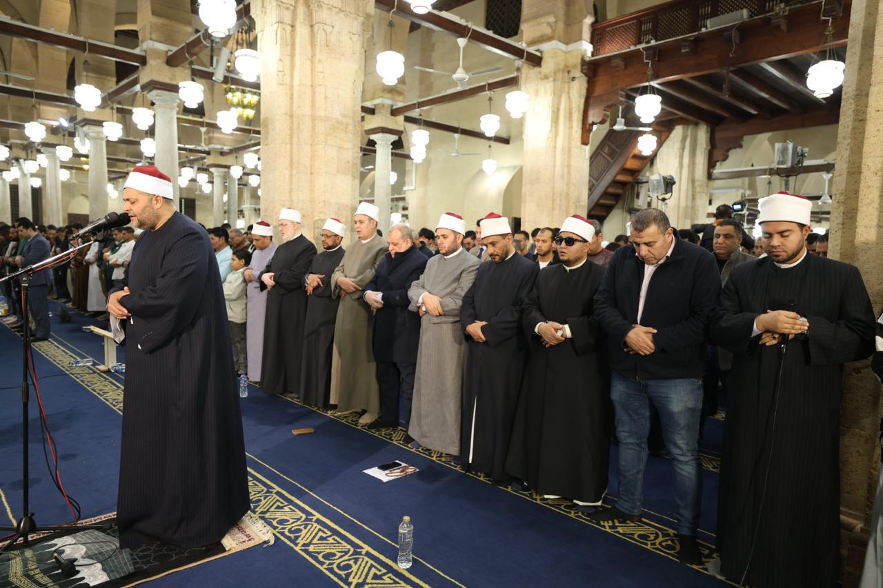 وتقدَّم صفوف المصلين الليلة فضيلة الأستاذ الدكتور محمد الضويني، وكيل الأزهر، وفضيلة الأستاذ الدكتور محمد الجندي، الأمين العام لمجمع البحوث الإسلامية، وفضيلة الأستاذ الدكتور عبد المنعم فؤاد، المشرف العام على أروقة الجامع الأزهر، إلى جانب لفيف من قيادات الأزهر وعلمائه، وقد أقيمت صلاة العشاء من سورة الأنفال برواية ‏حفص عن عاصم، وأمّ المصلين فيها الشيخ رضا السويفي، بينما أقيمت صلاة التراويح من سورتي الأنفال والتوبة برواية السوسي عن أبي عمرو البصري، وروح عن يعقوب الحضرمي، وخلف عن حمزة الكوفي، وأمّ المصلين فيها الشيخ محمد سالم عامر، والشيخ رمضان خليف، والشيخ كمال العمدة، بينما أمّ المصلين في ركعتي الشفع والوتر الشيخ شعبان سيد حسين.