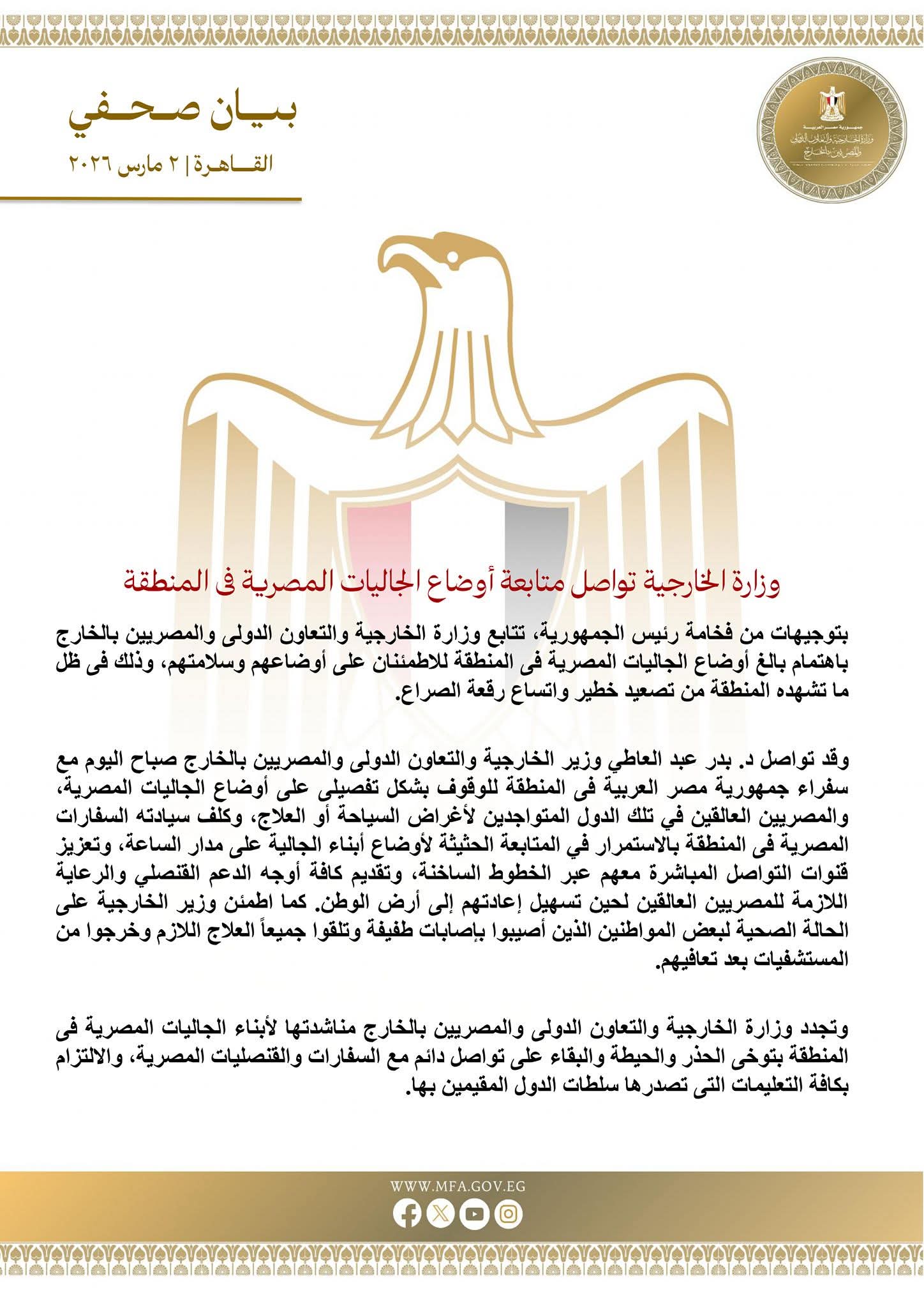 بتوجيهات من فخامة رئيس الجمهورية، تتابع وزارة الخارجية والتعاون الدولى والمصريين بالخارج باهتمام بالغ أوضاع الجاليات المصرية فى المنطقة للاطمئنان على أوضاعهم وسلامتهم، وذلك فى ظل ما تشهده المنطقة من تصعيد خطير واتساع رقعة الصراع.