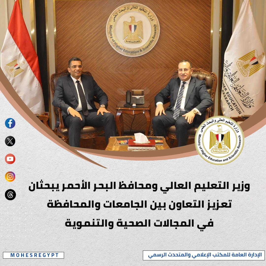عقد د.عبدالعزيز قنصوة، وزير التعليم العالي والبحث العلمي، اجتماعًا مع د.وليد البرقي، محافظ البحر الأحمر، وتناول الاجتماع مناقشة أوجه التعاون بين الوزارة ومحافظة البحر الأحمر، للاستفادة من خبرات أعضاء هيئة التدريس بكليات الطب في الجامعات المصرية؛ لتقديم خدمات الكشف والفحص، وإجراء العمليات الجراحية للمرضى بمستشفيات المحافظة، فضلا عن تدريب الأطباء العاملين بها ورفع كفاءتهم المهنية، كما ناقش الاجتماع آليات الإسراع باستكمال إنشاء الكليات والمنشآت الجامعية بجامعة الغردقة، إلى جانب الإسراع بتنفيذ المنشآت الرياضية الخاصة بالجامعة، بما يسهم في تقديم خدمات رياضية متميزة ، ويشكل إضافة مهمة لأبناء المحافظة.