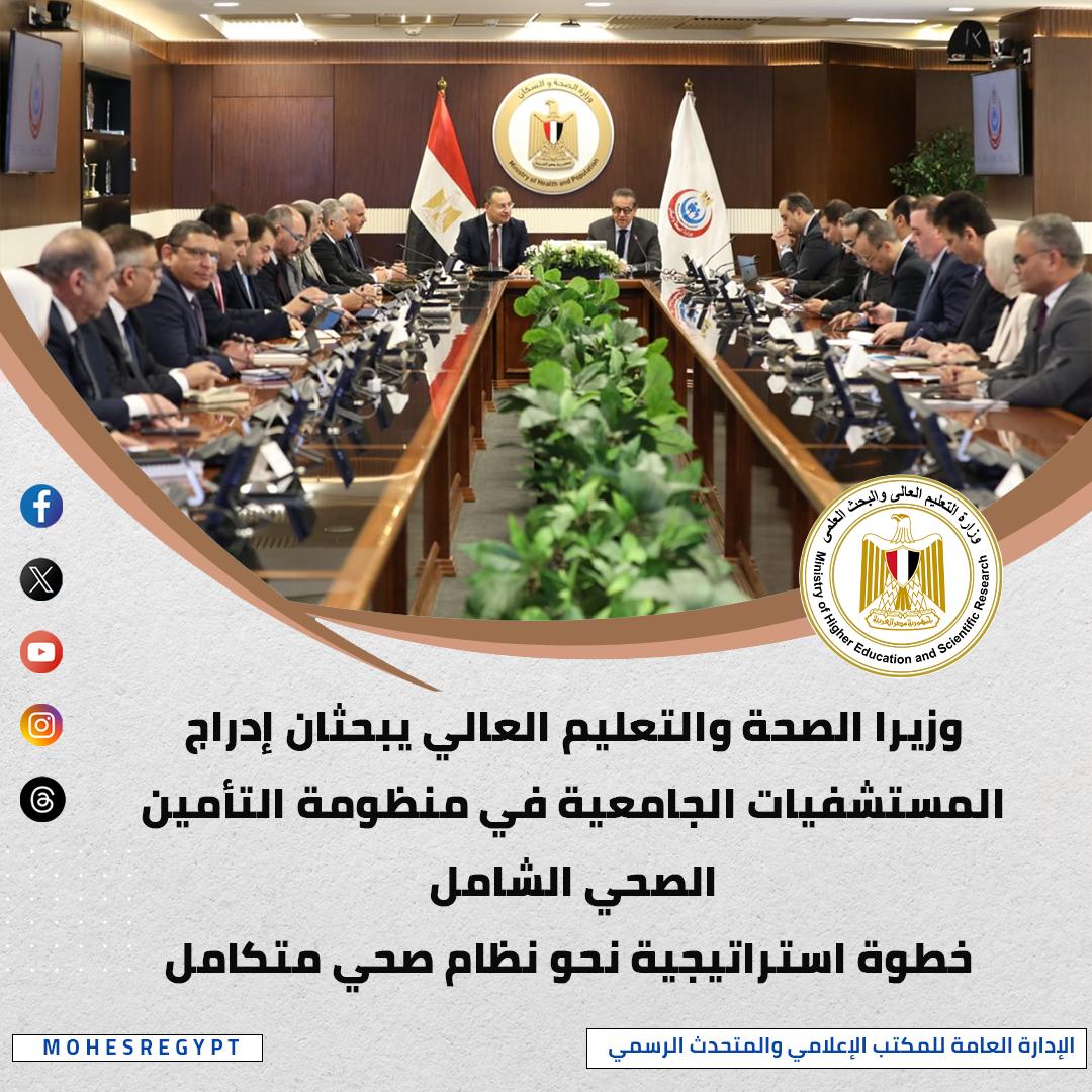 شهد الدكتور عبدالعزيز قنصوة وزير التعليم العالي والبحث العلمي اجتماعًا هامًا لوضع آليات تكاملية لإدراج المستشفيات الجامعية ضمن منظومة التأمين الصحي الشامل بمراحلها المتتالية على مستوى الجمهورية، باعتبارها شريك أساسي في بناء نظام صحي تكافلي متكامل يضمن العدالة والجودة لكل مواطن، وأكد الوزير أن المستشفيات الجامعية تمثل ركيزة أساسية في المنظومة، مشيرًا إلى أن الفترة المقبلة ستشهد تعزيزًا لآليات التنسيق لتوسيع إسهامها في تقديم الخدمات ورفع كفاءة التشغيل وجودة الرعاية، مع الاهتمام الكبير بدعم التدريب والتعليم الطبي المستمر وتطوير الممارسات الإكلينيكية وفق أحدث المعايير العالمية.