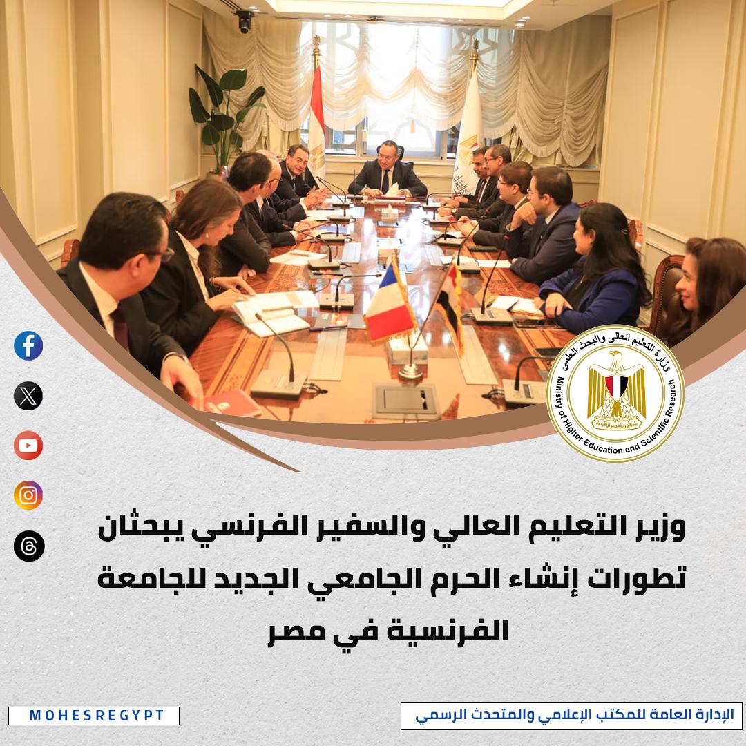 التقى الدكتور عبدالعزيز قنصوة وزير التعليم العالي والبحث العلمي، السيد/ إيريك شوفالييه سفير فرنسا بالقاهرة والوفد المرافق له، لمتابعة مستجدات مشروع الحرم الجامعي الجديد، وخلال الاجتماع، تم استعراض الموقف التنفيذي للأعمال الإنشائية الجارية بالحرم الجامعي الجديد، حيث قُدم عرض تفصيلي بشأن نسب الإنجاز ومعدلات التنفيذ، التي تسير وفق الجداول الزمنية المحددة، مع التأكيد على الالتزام بمعايير الجودة في كافة مراحل التنفيذ، كما ناقش الجانبان سبل دعم المشروع لتعزيز مكانة الجامعة كمؤسسة أكاديمية وبحثية رائدة، تعتمد على أحدث النظم الرقمية والتكنولوجية، وتوفر بيئة تعليمية حديثة تدعم الابتكار والبحث العلمي.