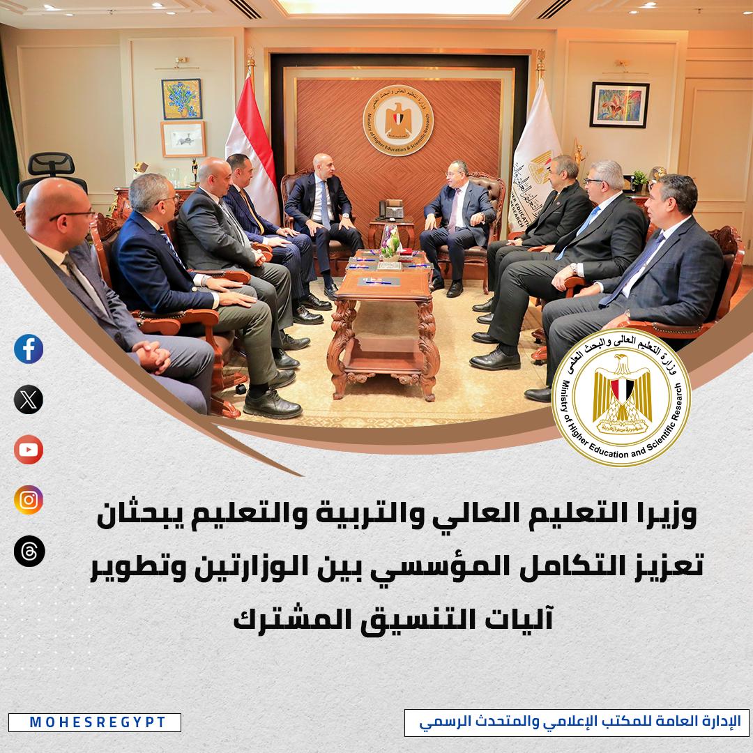 عقد الدكتور عبدالعزيز قنصوة وزير التعليم العالي والبحث العلمي، والسيد محمد عبداللطيف وزير التربية والتعليم والتعليم الفني، اجتماعًا بمقر وزارة التعليم العالي بالعاصمة الجديدة، وذلك لبحث سبل تعزيز التعاون وتطوير آليات التنسيق المؤسسي بين الوزارتين خلال المرحلة المقبلة، في إطار رؤية الدولة لتطوير المنظومة التعليمية بمختلف مراحلها، وأكد الدكتور عبدالعزيز قنصوة على أهمية ما شهدته منظومة التعليم قبل الجامعي من إصلاحات وجهود متواصلة للارتقاء بالمنظومة، مشيراً إلى أن المرحلة الراهنة تتطلب تعظيم الاستفادة من تلك الجهود وربطها بمستهدفات التعليم العالي، بما يواكب التحولات المتسارعة في سوق العمل محليًا ودوليًا، وأكد وزير التعليم العالي استمرار العمل على تنفيذ الرؤية الوطنية التي تستهدف ترسيخ مكانة مصر كمنصة تعليمية إقليمية ودولية جاذبة، تقدم خدمات تعليمية متميزة وتنافسية.