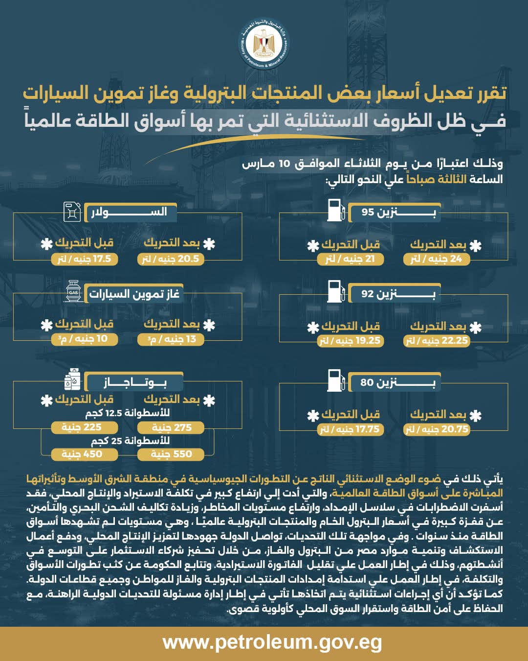 وزارة البترول : تعديل أسعار بعض المنتجات البترولية وغاز تموين السيارات في ظل الظروف الاستثنائية التي تمر بها اسواق الطاقة عالمياً