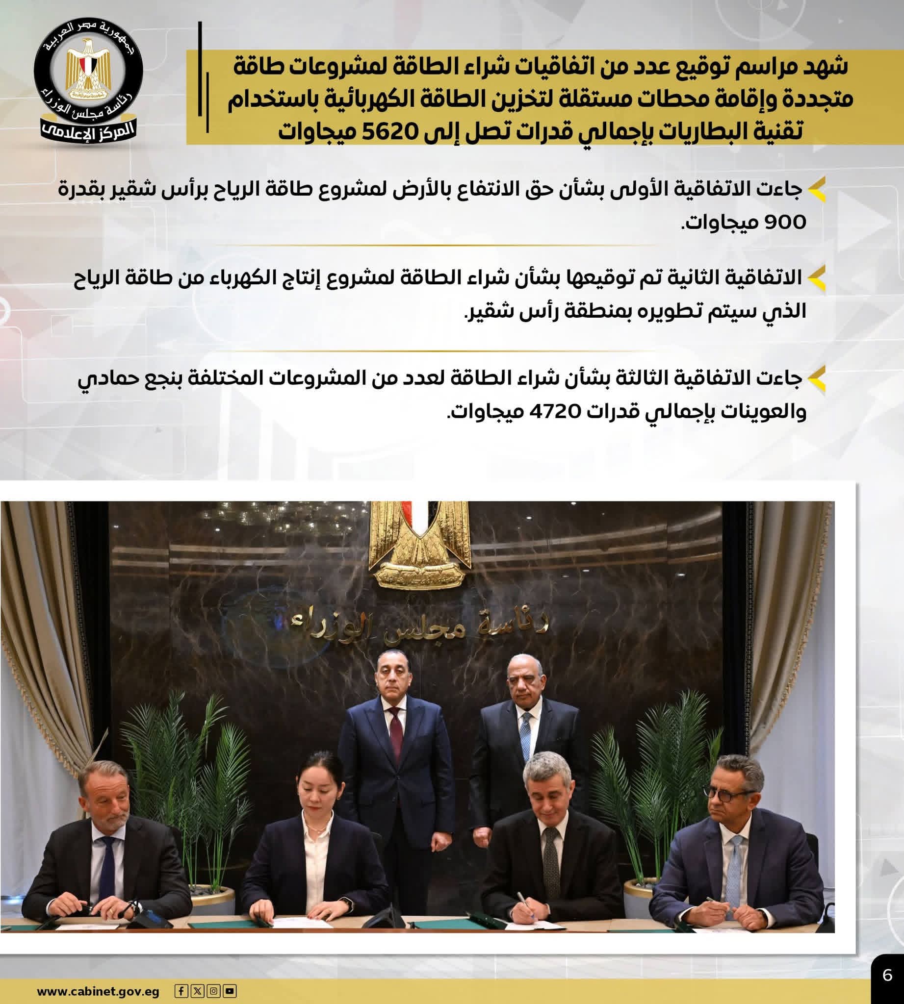 – شهدها رئيس الوزراء.. توقيع حزمة من اتفاقيات شراء الطاقة لمشروعات طاقة متجددة وإقامة محطات لتخزين الطاقة الكهربائية بقدرات تصل إلى 5620 ميجاوات
