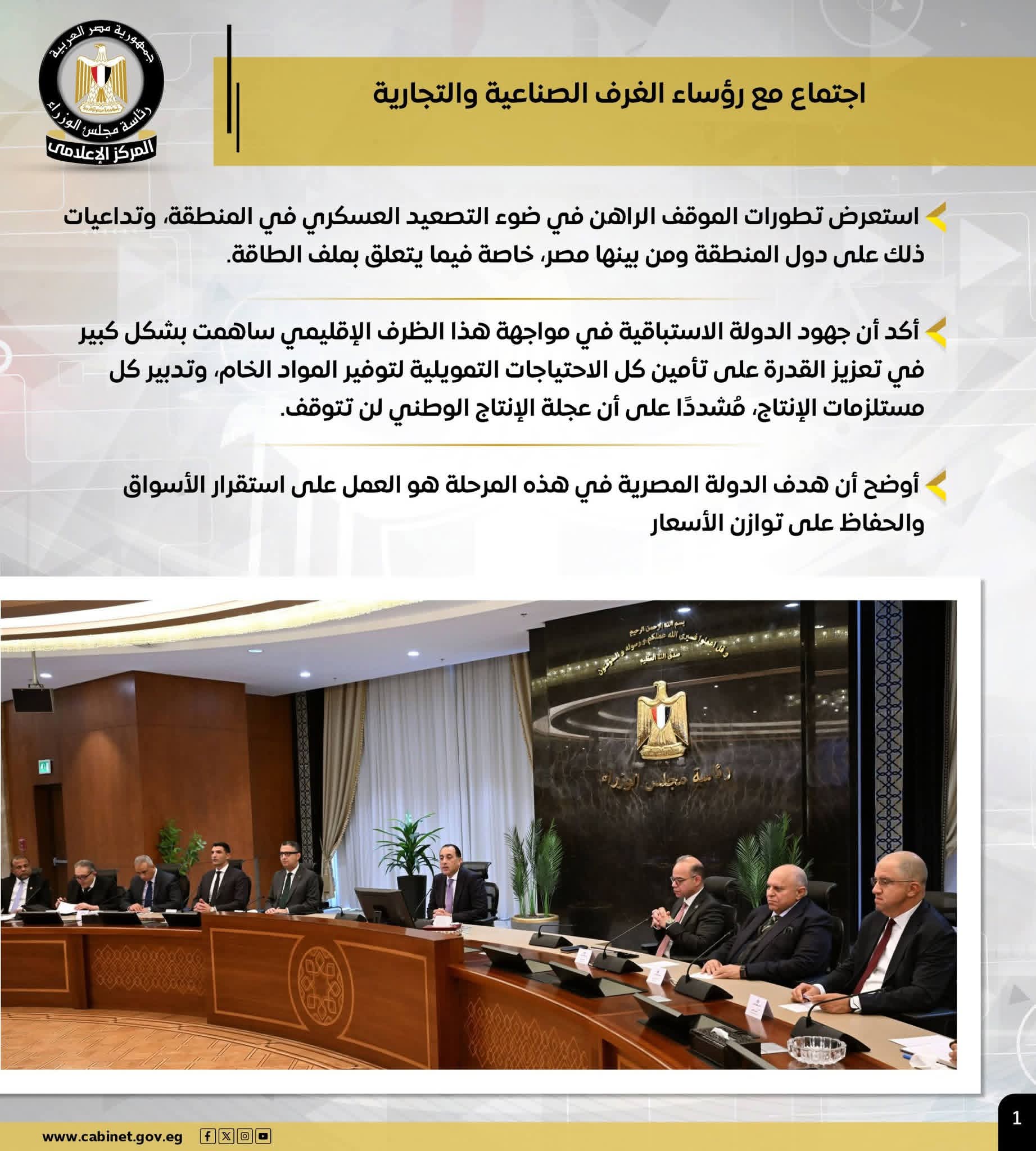– رئيس الوزراء: جهود الدولة الاستباقية في مواجهة هذا الظرف الإقليمي ساهمت في تعزيز القدرة على تأمين كل الاحتياجات التمويلية لتوفير المواد الخام