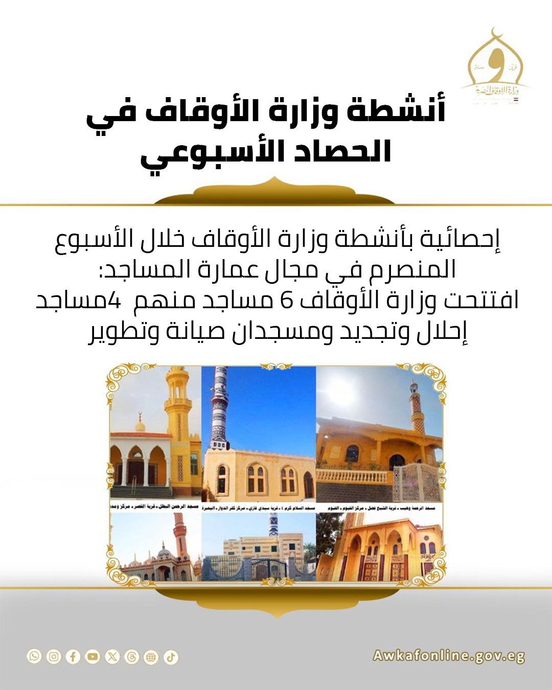 افتتحت وزارة الأوقاف 6 مساجد على مستوى الجمهورية، بواقع 4 مساجد إحلالًا وتجديدًا، و مسجدان صيانةً وتطويرًا.