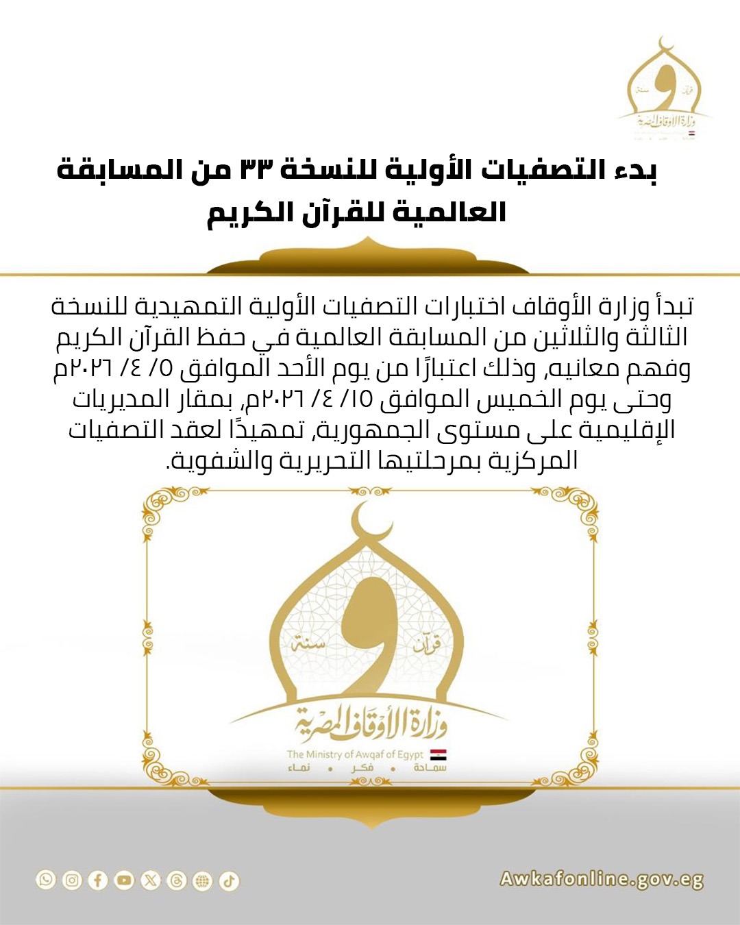 تبدأ وزارة الأوقاف اختبارات التصفيات الأولية التمهيدية للنسخة الثالثة والثلاثين من المسابقة العالمية في حفظ القرآن الكريم وفهم معانيه، وذلك اعتبارًا من يوم الأحد الموافق ٥/ ٤/ ٢٠٢٦م وحتى يوم الخميس الموافق ١٥/ ٤/ ٢٠٢٦م، بمقار المديريات الإقليمية على مستوى الجمهورية، تمهيدًا لعقد التصفيات المركزية بمرحلتيها التحريرية والشفوية.