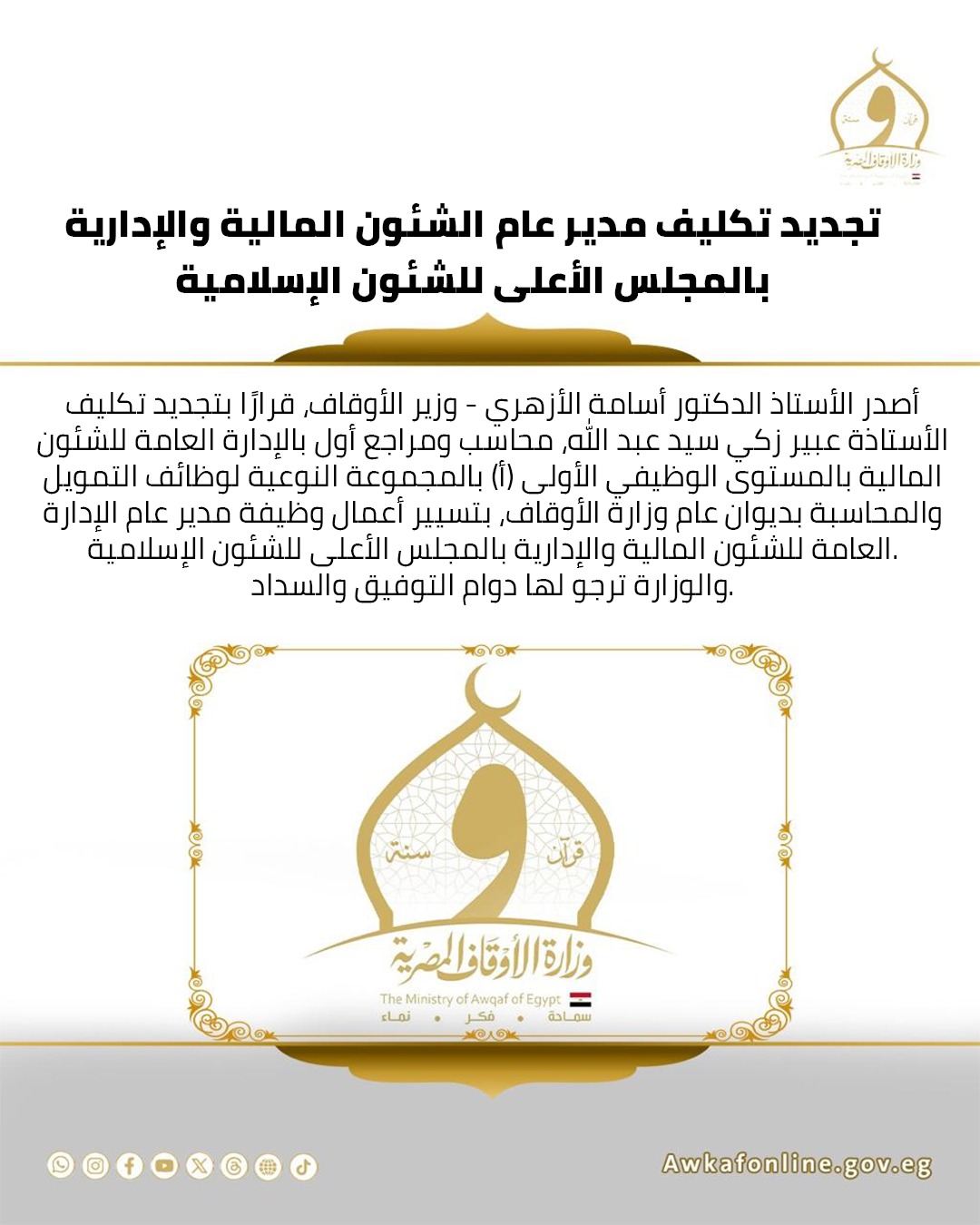 يأتي هذا القرار في إطار حرص وزارة الأوقاف على دعم الكفاءات الإدارية والمالية، وتعزيز كفاءة الأداء المؤسسي بما يسهم في تحقيق الأهداف التنظيمية والارتقاء بمستوى العمل.