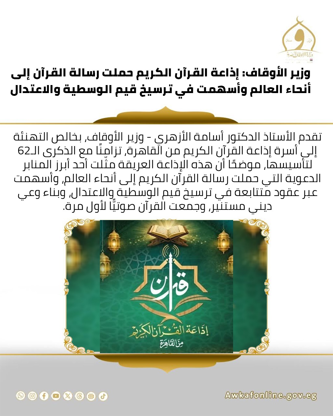 وأضاف وزير الأوقاف أن إذاعة القرآن الكريم قامت بدور رائد في نشر التلاوات العطرة لكبار القراء، إلى جانب ما قدمته من برامج علمية ودعوية أسهمت في تصحيح المفاهيم، ومواجهة الفكر المتطرف، وتعزيز الانتماء الوطني على أسس دينية راسخة، فضلًا عن كونها صاحبة الريادة في تسجيل وإذاعة الجمع الصوتي للقرآن الكريم بأصوات كبار القراء، بما مثّل حفظًا صوتيًّا فريدًا للتراث القرآني.