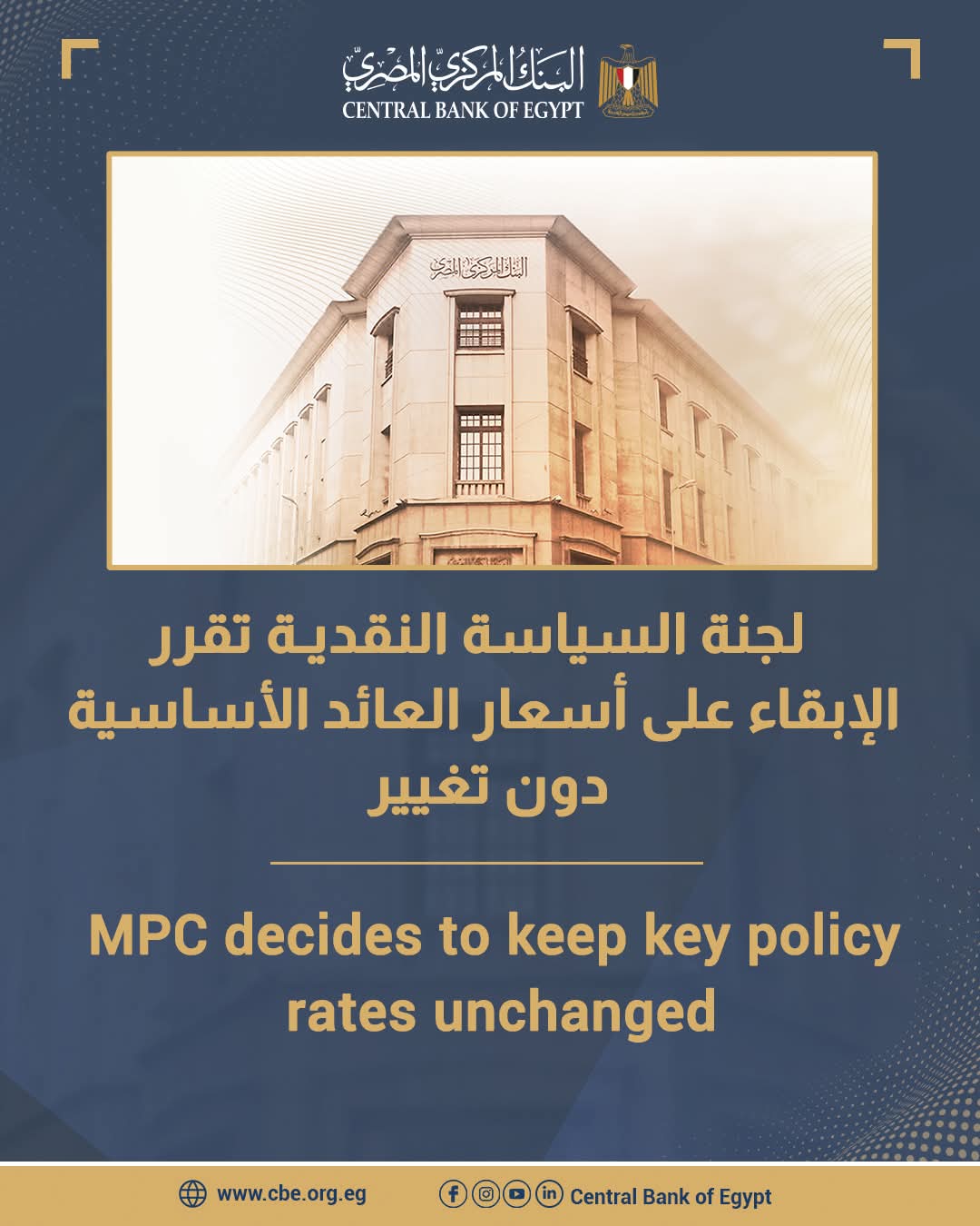 The Monetary Policy Committee (MPC) of the Central Bank of Egypt (CBE) today decided to keep the key policy rates unchanged. The overnight deposit rate, overnight lending rate, and the rate of the main operation remain at 19.0 percent, 20.0 percent, and 19.5 percent, respectively. The discount rate was also maintained at 19.5 percent. This decision reflects the Committee’s assessment of prevailing inflation dynamics and the evolving outlook since the previous MPC meeting.