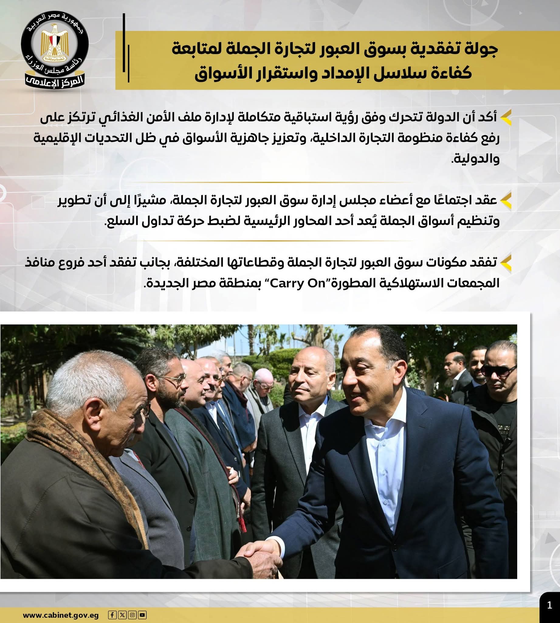 – خلال جولته التفقدية بسوق العبور.. رئيس الوزراء: رؤية استباقية للدولة لإدارة ملف الأمن الغذائي وتعزيز استقرار الأسواق