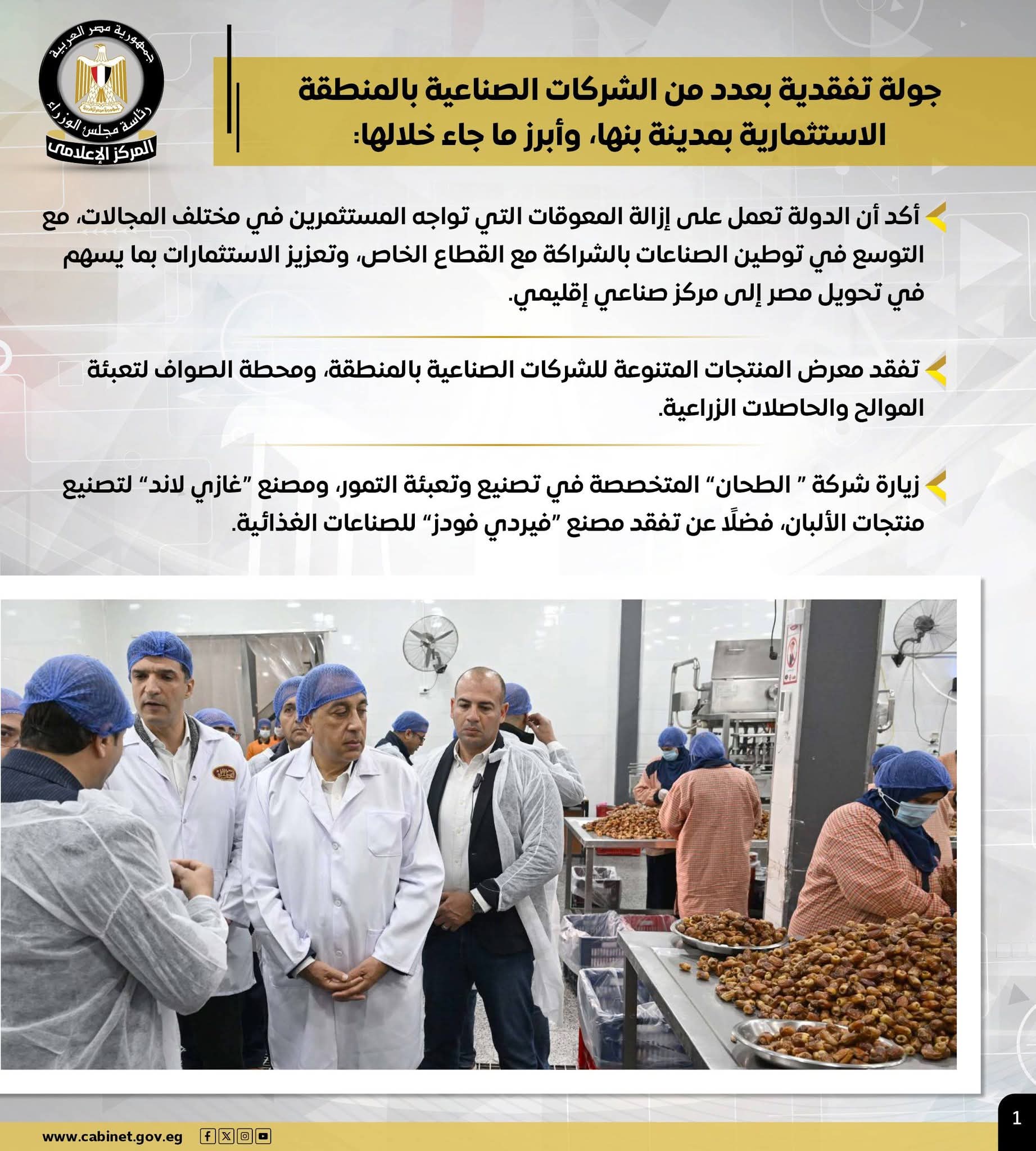 – خلال جولته التفقدية بالمنطقة الاستثمارية ببنها.. رئيس الوزراء: نعمل على إزالة المعوقات أمام المستثمرين ونواصل توطين الصناعات بالشراكة مع القطاع الخاص