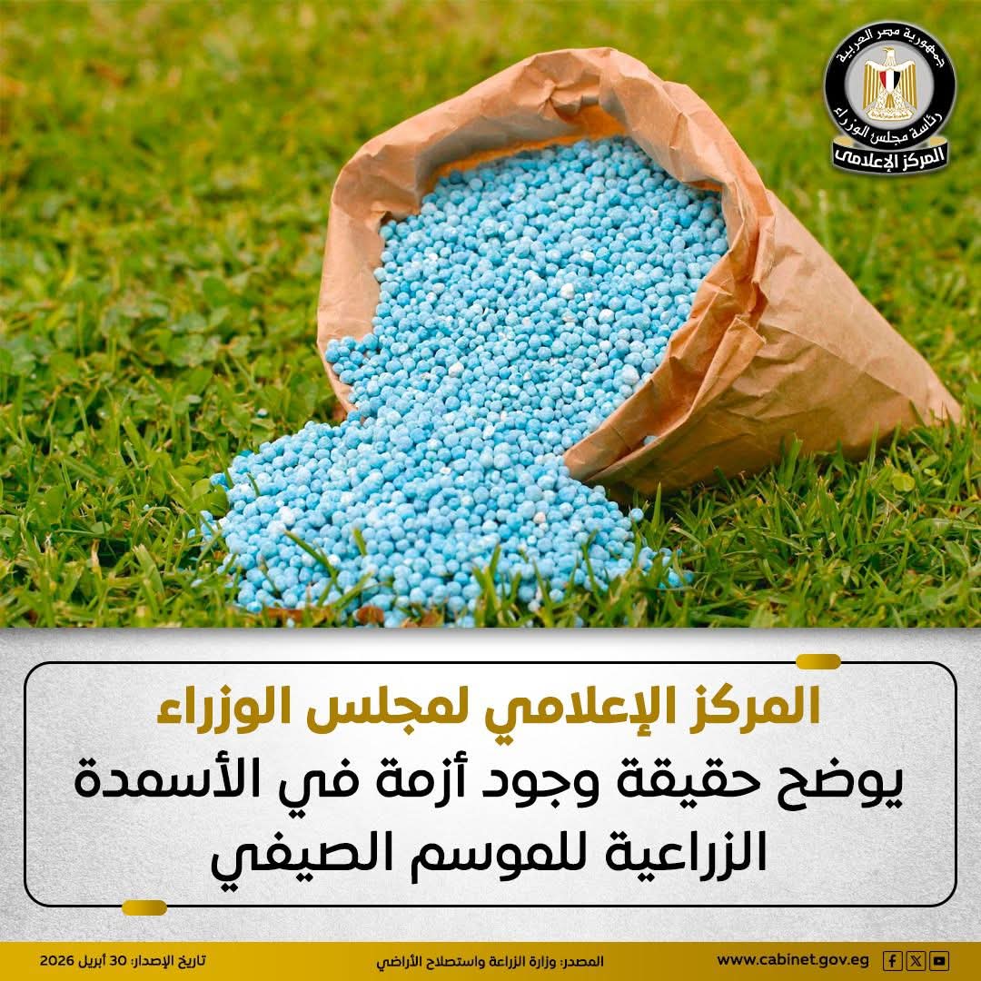 نشر المركز الإعلامي لمجلس الوزراء بيانًا عبر منصاته على مواقع التواصل الاجتماعي، أوضح خلاله حقيقة ما تم تداوله بشأن وجود أزمة في الأسمدة الزراعية للموسم الصيفي.