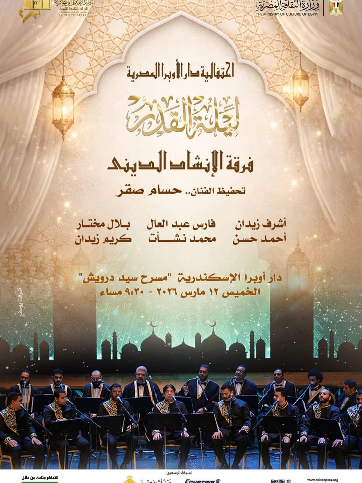 دار الأوبرا المصرية تستضيف فرقة أم كلثوم للموسيقى العربية يوم الجمعة ١٢ ديسمبر على مسرح سيد درويش بأوبرا اسكندرية